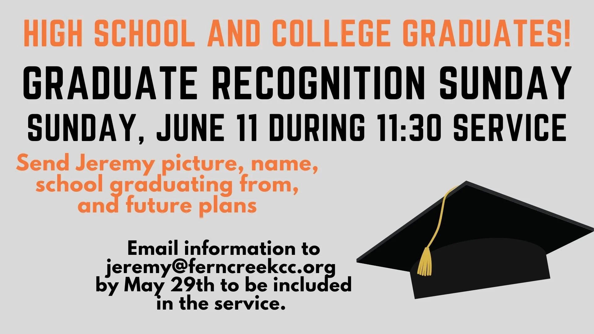 Calling all high school graduates! We want to recognize and celebrate you during the 11:30 service on Sunday, June 11th. We need the following information from you: a picture, your name, school graduating from, and future plans. Make sure that is emailed to jeremy@ferncreekcc.org by Monday, May 29th or your information won’t be included in the service!
