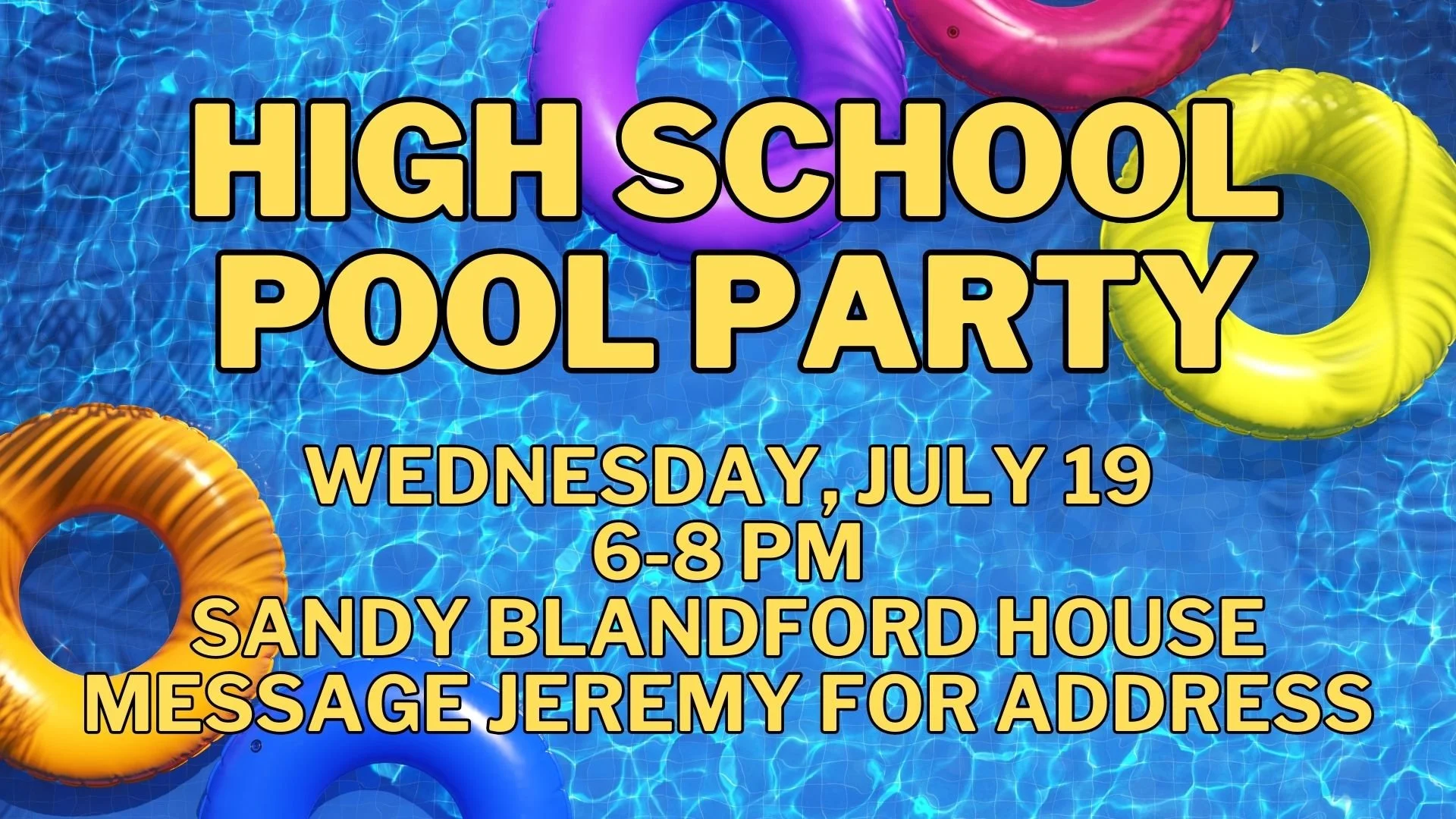 Want to catch a break from the heat? High Schoolers come join us for a pool party at Sandy Blandford’s house on Wednesday, July 19th from 6-8 pm. Message Jeremy for the address. See you there!