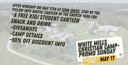 We love camp at Fern Creek and are very excited for camp at White Mills this summer! Come check out our camp booth outside after worship on Sunday, May 17th. We will be giving out a free snack and drink for all students and kids who stop by. There will be giveaways and information about the 50% discount code. See you then!